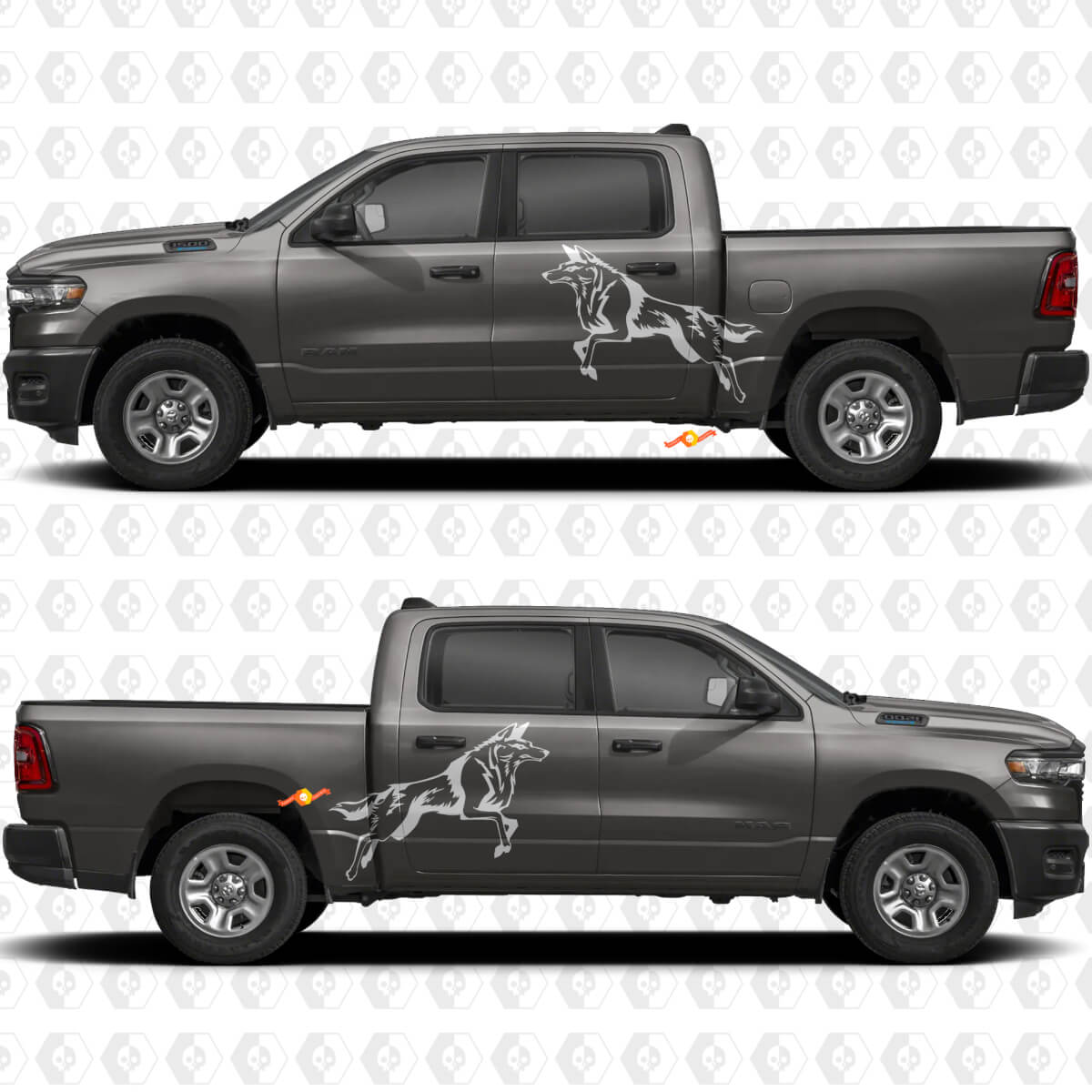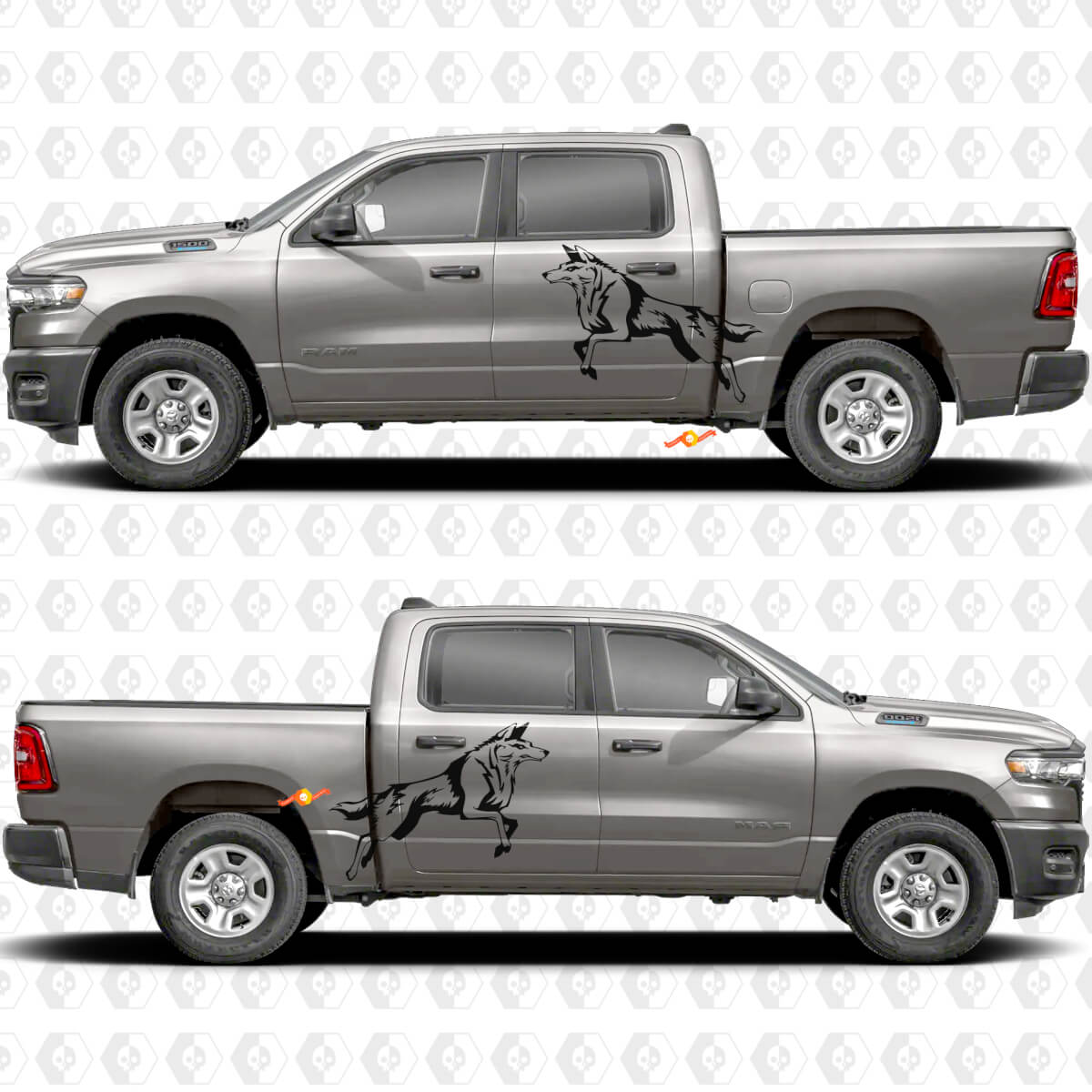 Trasforma le porte laterali e le aree del cassone del tuo veicolo con i nostri fantastici adesivi decalcomanie con splash a lupo. Queste decalcomanie in vinile di alta qualità presentano un design accattivante di un lupo con effetti splash dinamici, perfetti per aggiungere un aspetto audace e avventuroso alla tua auto o al tuo camion. Che tu voglia personalizzare il tuo mezzo o fare una dichiarazione sulla strada, questi adesivi resistenti offrono un aspetto nitido e vivido che si fa notare.
