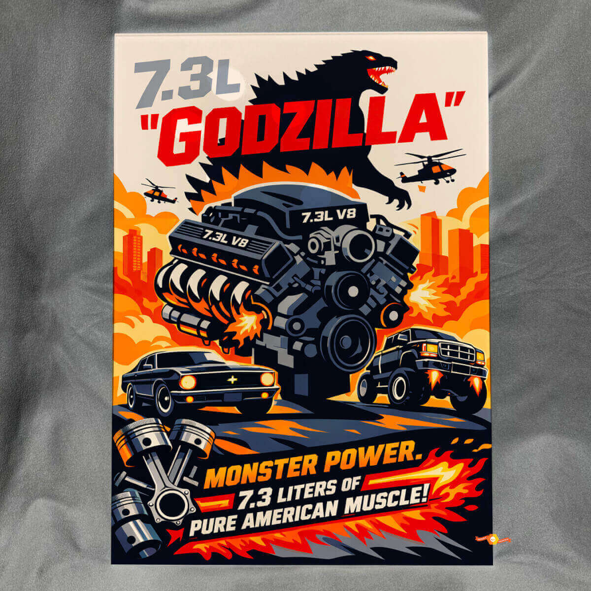 Migliora il tuo spazio con questo unico pannello murale 7.3L Godzilla Monster Power e celebra con stile il tuo entusiasmo automobilistico.