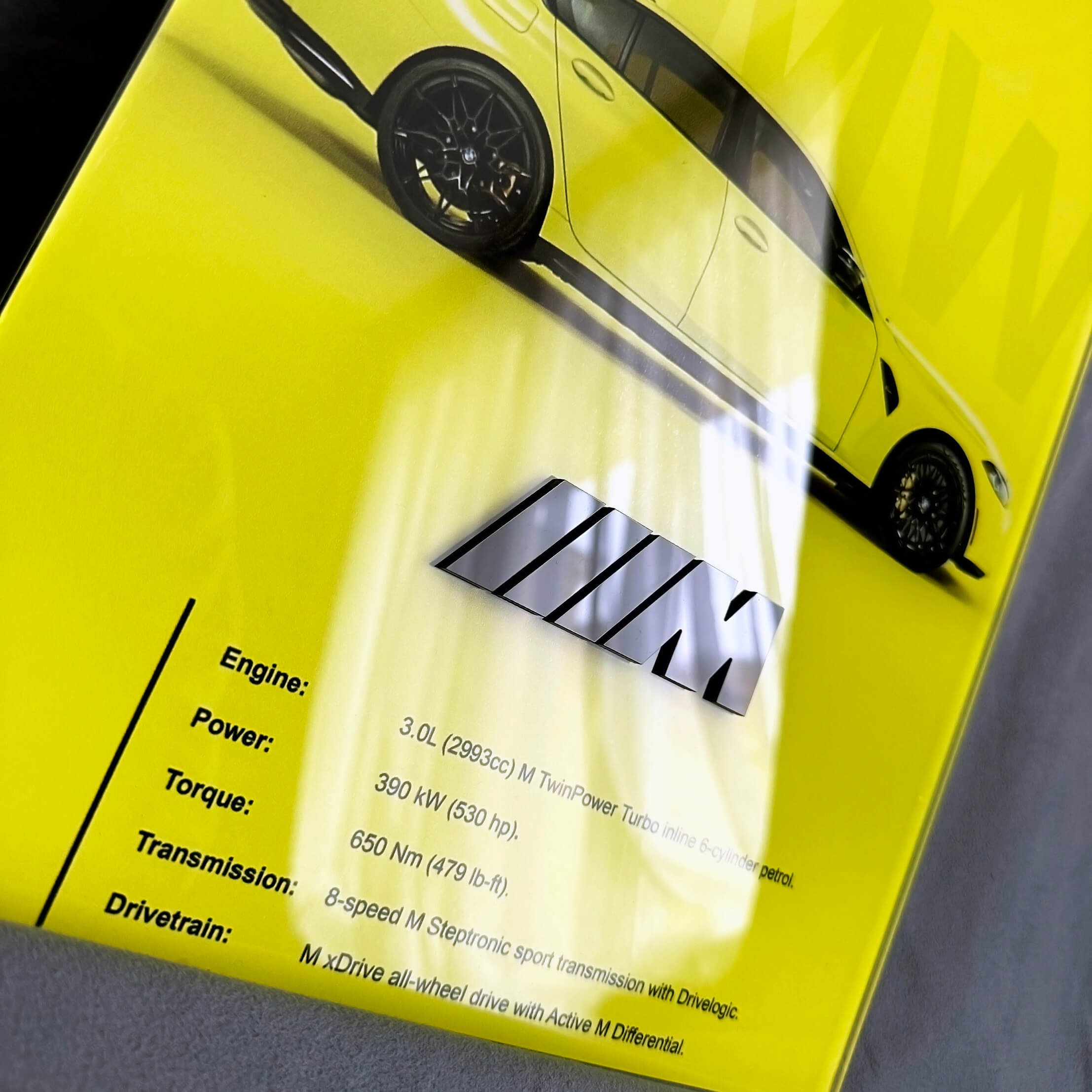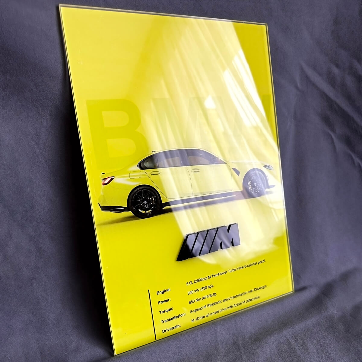 Migliora il tuo garage o la tua "man cave" con questo pannello d'arte murale in acrilico lucido BMW M3 G80. Progettato per gli appassionati di auto, presenta una finitura elegante ad alto lucido che mette in risalto lo stile iconico della BMW M3 G80.