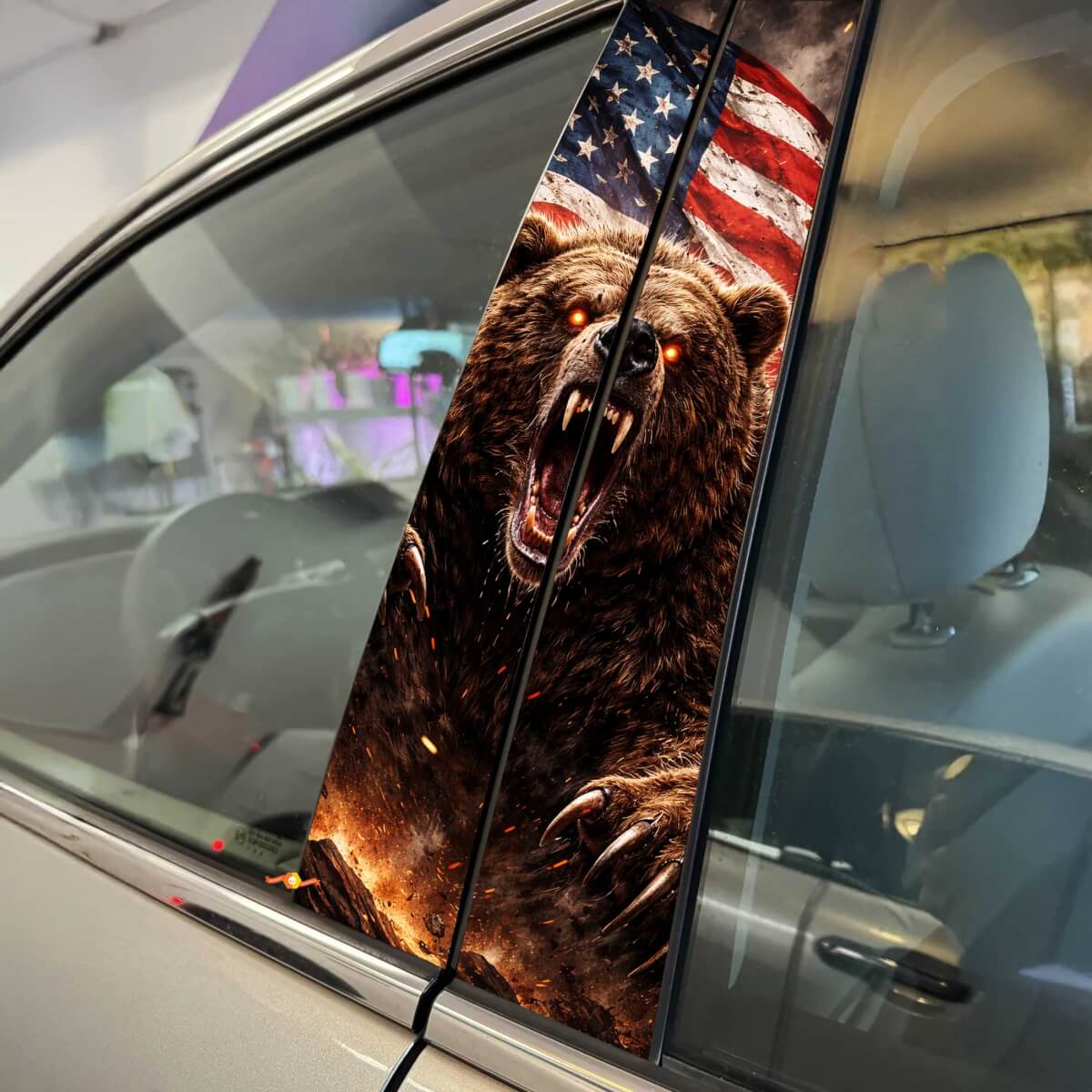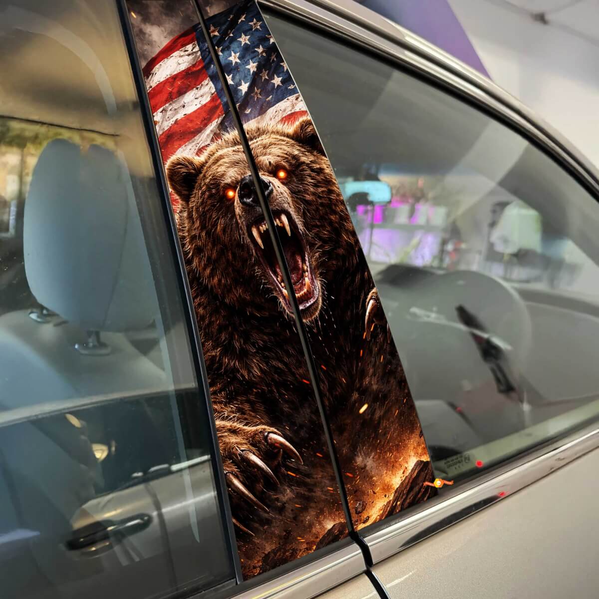 Migliora l'aspetto del tuo veicolo con l'adesivo in vinile Bear Rage American Flag Pillar Doors. Questo design accattivante presenta l'immagine potente di un orso combinata con la iconica bandiera americana, perfetto per mostrare il tuo patriottismo e la tua personalità audace sulle porte montanti della tua auto.